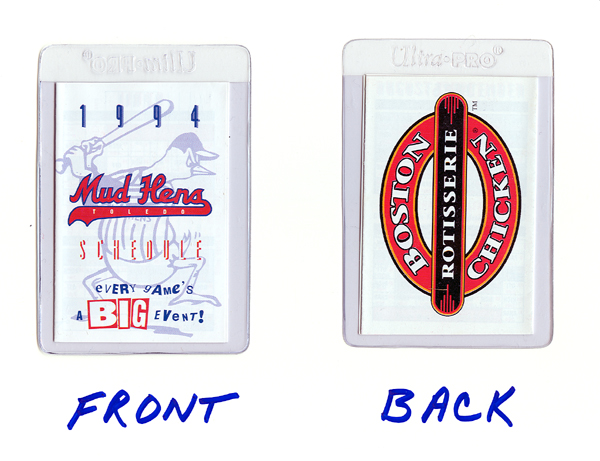 1994 Toledo Mud Hens Pocket Schedule. Mud Hens Logo on the front and Boston Chicken advertisement on the back. Folded, 1 by 4 Panel design..